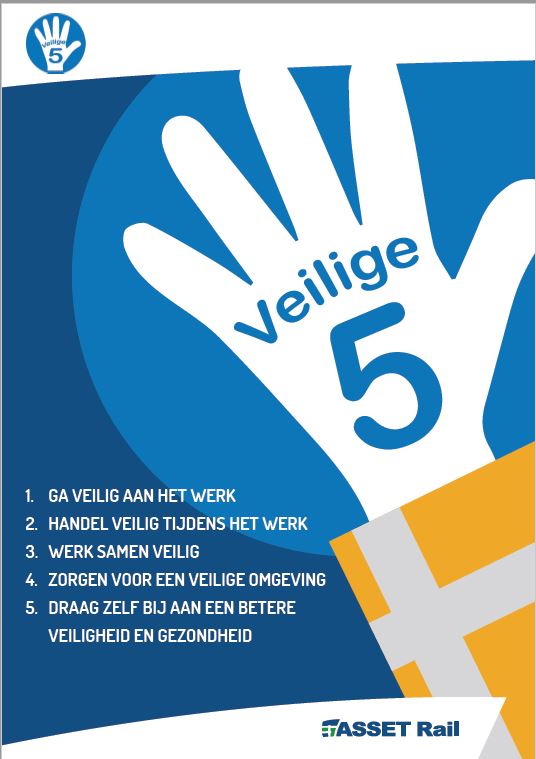 Wij werken veilig, of wij werken niet. Binnen ASSET Rail is veiligheid verankerd in ons dagelijks handelen. We hebben een proactieve veiligheidscultuur, waarin de veilige 5 de basis vormt. We spreken elkaar aan op onveilig gedrag, melden incidenten en signaleren onveilige situaties. Door actief te leren van eerdere ervaringen en incidenten volgens het principe Voorkomen is beter! Zo versterken we voortdurend onze veiligheidscultuur.